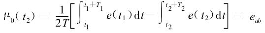 ②正負勵磁下的同相位采樣。圖1 是對應低頻矩形波勵磁形式下的典型電勢信號形式,按上述關系在一個勵磁周期下 ,若假設 t 1 和 t 2 點為工頻干擾的等效干擾點 , 且采樣寬度 T =T 1 =T 2 ,則 e ab 的基本算式為