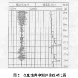 圖2是在中40-PXX配注井中的測井曲線。測試條件是儀器在油管和配注工具內(nèi)居中測井。左側(cè)是原磁性定位曲線,測井速度90m/h,曲線干擾嚴(yán)重,無法辨別出接箍和工具的設(shè)置情況。右側(cè)是更換后的接箍曲線,測井速度1200m/h,在 997m以上是油管段,各接箍位置清楚,在997m以下是工具段,各工具顯示清楚。在1006m~1007m和1032m~1034m兩處是Φ114mm封堵器;在1016m~1018m和1043m~1045m兩處分別是Φ54mm和Φ56mm的配水器短接,因其內(nèi)徑小而幅度高;1018m~1023m是5個(gè)配接短接。