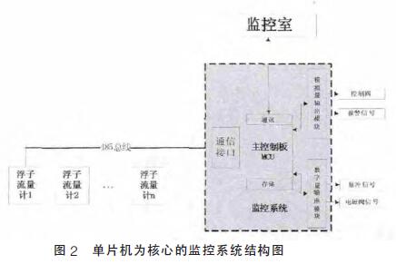 浮子流量計監(jiān)控系統(tǒng)主要功能是模擬量采集輸出, 數(shù)字量采集輸出,由核心模塊進行分析、處理、存儲并和上位機通信。工業(yè)上常用的監(jiān)控系統(tǒng),從組成結(jié)構來看主要分為PLC為核心的監(jiān)控系統(tǒng)、現(xiàn)場總線為核心的監(jiān)控系統(tǒng)、單片機為核心的監(jiān)控系統(tǒng)。本設計主要采用以單片機為核心的監(jiān)控方法,該系統(tǒng)使用廣泛,體積小、功耗低、操作方便、設計簡便、成本低,是許多小型監(jiān)控系統(tǒng)的*選。單片機為核心的監(jiān)控系統(tǒng)結(jié)構如圖2所示。本監(jiān)測系統(tǒng)主要包括現(xiàn)場浮子流量計組、485總線、主控制板MCU 以及模擬數(shù)字輸出控制模塊。