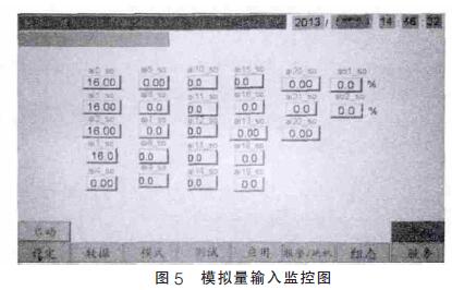 上位機觸控屏軟件是利用觸控屏供應商的組態(tài)軟件設計的,作為一個將運用于工業(yè)現(xiàn)場的監(jiān)控設備,其實用性和易用性是使用者比較重視的。當下位機的通訊任務接收到信號量, 主控制模塊就會開始和上位機通信。下位機將采集到處理完整的數(shù)據(jù)傳輸?shù)缴衔粰C內(nèi),上位機將其顯示到觸控屏上,使用者可以通過上位機了解空壓機組的實時狀態(tài)。圖5 和圖6 就是模擬量和數(shù)字量各個通道的實時值顯示畫面。
