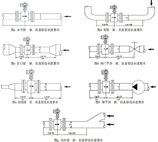 比較理想的安裝地點應(yīng)選擇測量點前后有足夠的直管段。進口直管段應(yīng)≥5D,出口直管段≥3D(D為傳感器公稱口徑)。