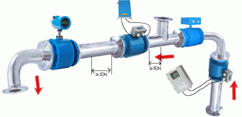 傳感器上游要有一定的直管段,但其長度與其它流量儀表(如超聲波流量計(jì))相比較要求較低。上游如有90°彎頭、T形管、同心異徑管、全開閘閥等擾流件,一般要求離電極中心線(不是傳感器進(jìn)口斷面)有5倍直徑(5D)長度的直管段,如是上游有閘閥且沒有全部打開,一般要求10D長度的直管段;下游直管段長度一般為2D-3D,或更短;