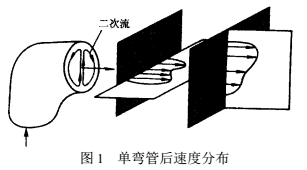 流體流過彎管由于離心力作用,靠外壁產(chǎn)生擴散效應(yīng),內(nèi)壁產(chǎn)生收縮效應(yīng),由此產(chǎn)生橫向流動的二次流,引起下游產(chǎn)生速度分布畸變,如圖1所示。圖1中,右邊垂直剖面彎管外緣流速較快,水平剖面呈雙峰值流速分布。隨著液流離開彎管距離增加.畸變會趨于緩和。