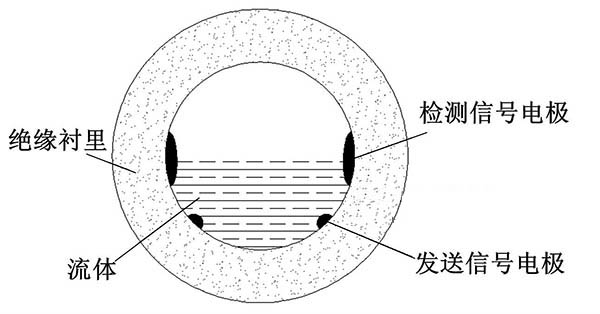 ③利用阻抗或信號衰減研制的非滿管一寸管污水流量計。這種結(jié)構(gòu)的非滿管一寸管污水流量計是當(dāng)前國內(nèi)研究的方向之一。其結(jié)構(gòu)是流量管底部貼一對信號發(fā)射電極,在流量管中間貼信號接收電極。由于信號在流體中傳播會產(chǎn)生衰減,且傳播時間越長,衰減越多,因此通過信號接收電極接收到的信號衰減量即可得知液面高度;同時該電極還能測量流體切割磁感線產(chǎn)生的電動勢,以此達(dá)到測量非滿管流量的目的。阻抗式或信號衰減非滿管一寸管污水流量計結(jié)構(gòu)簡圖如圖5所示。