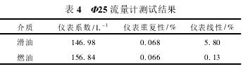 依據表3測試數據,經計算可得,Φ25流量計在滑油及燃油中測試結果如表4所示,測試線形圖如圖3所示。