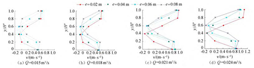 圖4橫坐標(biāo)為斷面水流方向流速,縱坐標(biāo)為測點垂向位置與下游水位的比值y/H'。隨著浮體結(jié)構(gòu)位置的上升,*小斷面流速位置同樣上升。以圖3(a)為例,當(dāng)e=0.02m時,下游斷面位置自下而上呈現(xiàn)先減小、后增大的趨勢,在y/H'=0.40時流速達(dá)到*小,隨著浮體結(jié)構(gòu)位置的上升,*小流速呈現(xiàn)向上偏移的趨勢。在斷面位置y/H'=0.20時,隨著e的增大,流速呈現(xiàn)增大的趨勢。當(dāng)e較小時,流經(jīng)浮體結(jié)構(gòu)下部進行下泄的水流較少,主流出現(xiàn)在浮體結(jié)構(gòu)的上部,且在浮體結(jié)構(gòu)的阻擋作用下出現(xiàn)回流區(qū);隨著e上升,主流偏向浮體結(jié)構(gòu)下部區(qū)域,流速增大。與y/H'=0.20的流速分布正好相反,當(dāng)y/H'=0.80時,流速分布隨著浮體位置的增大而減小。隨著e的增大,通過浮體結(jié)構(gòu)下部泄流的水體增多,主流開始向下偏移。試驗過程中,浮體結(jié)構(gòu)處于淹沒狀態(tài),流速的分布隨著浮體位置的改變呈現(xiàn)上大、中小、下大的分布趨勢,在浮體結(jié)構(gòu)下游區(qū)域形成回流區(qū),回流區(qū)的位置隨著浮體結(jié)構(gòu)的上升而上升。