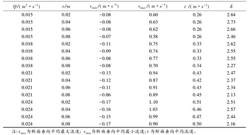 流速沿斷面分布的均勻特性可以通過流速分布不均勻系數(shù)進行表征,通過所選取斷面*大流速和*小流速的差值與該斷面平均流速的比值,δ值越大表明浮體結(jié)構(gòu)的存在對水流斷面流速的分布產(chǎn)生的影響較大。表2中,當(dāng)來流流量相同時,流速的不均勻系數(shù)多數(shù)隨e的增大而減小。浮體結(jié)構(gòu)位置較小時,主流為浮體結(jié)構(gòu)上部的水流。隨著浮體結(jié)構(gòu)位置的上升,來自上游的水體逐漸分成浮體結(jié)構(gòu)上部和下部的兩股主流,流速分布的不均性減小。浮體結(jié)構(gòu)位置及所處水位條件相同時,來流流量的增大,區(qū)域的平均流速增大,因此流速不均勻性減小。