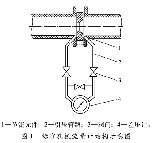 標準二氧化碳流量計結(jié)構(gòu)如圖1所示,包括節(jié)流元件(標準孔板及其取壓裝置)、傳輸壓差信號的引壓管路、閥門以及差壓計等部分。標準孔板是壓差測量時的一次元件,人們利用它在管道內(nèi)使流體產(chǎn)生壓差,再通過引壓管路把孔板前、后產(chǎn)生的壓差傳送給差壓變送器,再輸人到二次儀表,從而顯示出管道內(nèi)流體的靜壓、壓差、瞬時流量和累計流量等計量參數(shù)。