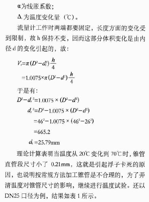為了保持聚四氟乙烯零件尺寸的穩(wěn)定性,規(guī)定其溫度應(yīng)用范圍是70℃以下。在試制的初始階段,用常規(guī)加工方法,即按圖紙尺寸進(jìn)行錐管和浮子的加工,可以發(fā)現(xiàn),在常溫下工作正常的浮子在高溫試驗(yàn)中出現(xiàn)了卡死現(xiàn)象,反復(fù)的試驗(yàn)都得到同樣的結(jié)果。實(shí)際測(cè)量表明:浮子尺寸變化不大,因此推斷是由于錐管尺寸的變化引起卡死現(xiàn)象。通過(guò)理論計(jì)算,得出結(jié)論,以利改進(jìn)。