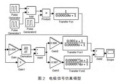 電極上的感應電動勢在沒有經(jīng)過放大之前一般很小, 取值在幾毫伏到幾百毫伏之內,本次仿真中流速感應電勢取 10mV。放大器的輸入電阻遠遠大于內阻,文獻中給出電荷傳遞電阻為 Rs=50Ω。 電極接觸電阻與溶液電導率有關一般取 Rt=15kΩ。雙電 層 電 容 C1=20μF。 將各參數(shù)值代入到式(7)中,可得 k1=0.998,T1=0.001,T=9.9×10-4。 理想情況兩個電極參數(shù)取值相等, 實際中兩者會存在差異對于電極 B 可 取 K1=0.997,T1=9.75×10-4,T2=9.74×10-4。