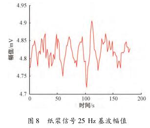 在頻域中對(duì)紙漿信號(hào)觀(guān)察時(shí)發(fā)現(xiàn),紙漿信號(hào)的漿液噪聲頻帶在零頻率點(diǎn)附近,距離流量信號(hào)基波頻率點(diǎn)較遠(yuǎn),對(duì)基波幅值和各奇次諧波幅值基本沒(méi)有影響,紙漿信號(hào)在頻域中的圖形如圖7所示。選擇一組采集的紙漿信號(hào),把其等分成數(shù)段,利用MATLAB計(jì)算每段數(shù)據(jù)在基波處的幅值并提取保存在一個(gè)數(shù)組中,使用繪圖工具畫(huà)出來(lái),如圖8所示??梢?jiàn),基波幅值在4.7~4.95mV變化,波動(dòng)較小。因此,提取到的與流量相關(guān)的感應(yīng)電動(dòng)勢(shì)信號(hào)幅值會(huì)比較穩(wěn)定。