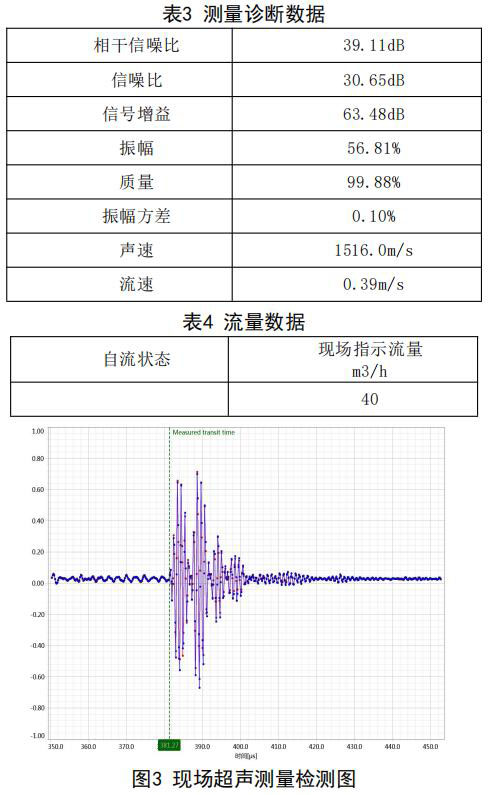 在機(jī)組自流補(bǔ)給水狀態(tài):同樣采用德國FLUEX 高精度外夾式超聲波流量計(jì)作為標(biāo)準(zhǔn)流量計(jì),測(cè)量 基礎(chǔ)數(shù)據(jù):管道外徑276.93mm,管壁厚度12.40mm, 采用兩聲程169mm傳感器安裝距離,通過對(duì)超聲波流量計(jì)信號(hào)分析與診斷(數(shù)據(jù)見表3和表4),超聲 波流量計(jì)測(cè)量狀態(tài)符合條件,開始測(cè)量,打開凝汽 器入口閥門,流量測(cè)量情況如下