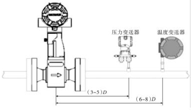 智能渦街流量計(jì)的口徑如果與工藝管道相同,不能滿足流量儀表要求時(shí),或者在此流速下測(cè)量準(zhǔn)確度不能保證時(shí),需要縮小儀表口徑,從而提高管內(nèi)流速,保證測(cè)量精度。上下游必須有足夠的直管段,若傳感器安裝點(diǎn)的上游在同一平面上有 2 個(gè) 90°彎頭時(shí),上游直管段≥25D,下游直管段≥5D。根據(jù)測(cè)量的需要,需在智能渦街流量計(jì)附近測(cè)量壓力和溫度時(shí),測(cè)壓點(diǎn)應(yīng)在傳感器下游的(3 ~5)D 處,測(cè)溫點(diǎn)應(yīng)在傳感器下游的(6 ~8)D 處,如圖 3 所示。