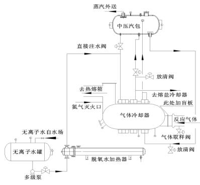 來(lái)自無(wú)離子水罐的脫氧水經(jīng)多經(jīng)泵加壓、經(jīng)脫氧水加熱器加熱后進(jìn)入到煤氣流量計(jì)的水段,脫氧水與反應(yīng)氣體換熱后分兩路:一路進(jìn)入中壓汽包,保證汽包有穩(wěn)定的液位;一路進(jìn)入熔鹽冷卻器帶出熔鹽攜帶的反應(yīng)熱。來(lái)自中壓汽包的高溫水經(jīng)管路接至煤氣流量計(jì)汽段底部,高溫水與反應(yīng)氣體換熱后產(chǎn)生高壓蒸汽,高壓蒸汽又返回中壓汽包。汽包還有一路直接注水管路,此路水不經(jīng)過(guò)煤氣流量計(jì)水段,而是直接進(jìn)入汽包。在煤氣流量計(jì)出口溫度偏低而汽包液位也比較低時(shí),可開(kāi)此直接注水管路來(lái)穩(wěn)定汽包液位。其詳細(xì)流程圖如圖 2。