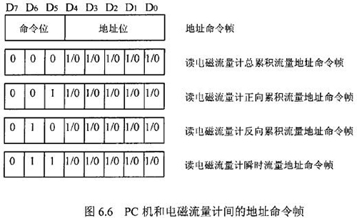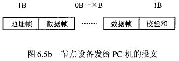 飲用水流量計等節(jié)點設備和C機通信的過程中,由地址幀、命令幀、數(shù)據(jù)幀、校驗和可組成各種功能不同的報文。由于采用主從工作方式來實現(xiàn)通信,飲用水流量計等節(jié)點設備僅能接收并執(zhí)行PC機發(fā)送來的控制命令,而不能發(fā)送命令給PC機。因此,由PC機發(fā)往流量計等節(jié)點設備的報文一般包括一個地址幀,一個命令幀,若干個數(shù)據(jù)幀和一個校驗和,其報文格式圖.6a5所示;而由流量計等節(jié)點設備發(fā)往PC機的報文一般包括一個地址幀,若干個數(shù)據(jù)幀和一個校驗和,其報文格式如圖6.5b所示。