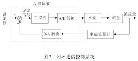 通信控制系統(tǒng)由工控機(jī)、變頻器、水泵、數(shù)據(jù)采集卡、煤油流量計(jì)等組成。在整個(gè)熱量表耐久性試驗(yàn)裝置中,煤油流量計(jì)與被試驗(yàn)熱量表串聯(lián)在試驗(yàn)管路中。系統(tǒng)設(shè)定流量值 qs,通過(guò)工控機(jī)發(fā)送信號(hào)給變頻器,來(lái)控制水泵運(yùn)轉(zhuǎn),系統(tǒng)通過(guò)研華數(shù)據(jù)采集卡 PCI1711 將采集到的煤油流量計(jì)當(dāng)前瞬時(shí)流量值反饋給工控機(jī),工控機(jī)將返回流量值與設(shè)定流量值qs進(jìn)行比較,從而確定是否需要重新調(diào)整變頻器頻率控制水泵轉(zhuǎn)速。此過(guò)程是一個(gè)完整的閉環(huán) PID 控制過(guò)程,其閉環(huán)控制過(guò)程如圖 2 所示。 2. 2 管路切換系統(tǒng)管路切換主要由冷熱水箱、水泵、開(kāi)關(guān)閥等組成。要實(shí)現(xiàn)熱量表耐久性 4000 次冷熱沖擊試驗(yàn),需要實(shí)時(shí)控制管路中熱水與冷水的交替使用。