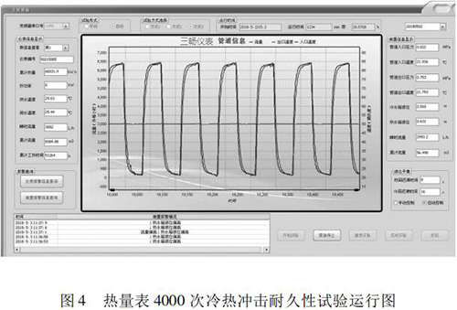 本文研究的 4000 次冷熱沖擊試驗(yàn)的實(shí)現(xiàn)具有以下特點(diǎn): (1)基于“工控機(jī) +水泵 + 煤油流量計(jì)”的閉環(huán)控制系統(tǒng),實(shí)現(xiàn)了流量自動(dòng)反饋調(diào)節(jié),滿(mǎn)足試驗(yàn)要求; (2)通過(guò)四個(gè)開(kāi)關(guān)閥的時(shí)序切換,自動(dòng)控制試驗(yàn)溫度,很好的完成了 4000 次溫度沖擊試驗(yàn); (3)通過(guò)“工控機(jī) + 數(shù)據(jù)數(shù)據(jù)采集卡”的數(shù)據(jù)采集系統(tǒng),實(shí)時(shí)監(jiān)控試驗(yàn)過(guò)程中的流量、溫度、壓力等相關(guān)參數(shù),實(shí)現(xiàn)試驗(yàn)方式的自動(dòng)控制,并能對(duì)試驗(yàn)數(shù)據(jù)進(jìn)行分析與評(píng)定。 (4)試驗(yàn)的全過(guò)程為智能自動(dòng)化,可無(wú)人員留守看護(hù)。試驗(yàn)結(jié)果可直接反映出熱量表在長(zhǎng)時(shí)間運(yùn)行后的可靠性。為我國(guó)熱量表耐久性試驗(yàn)研究提供檢測(cè)手段,為促進(jìn)產(chǎn)品質(zhì)量提升做好技術(shù)保障。