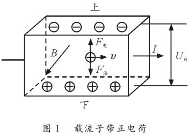 反之,如圖2所示,若載流子帶負(fù)電荷,則載流子在洛倫茲力作用下會向下偏轉(zhuǎn),導(dǎo)體下表面積累負(fù)電荷。同時(shí),上表面失去負(fù)電荷而帶上正電,從而使上表面電勢高于下表面。