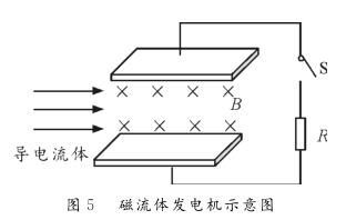 【例1】圖5為磁流體發(fā)電機(jī)示意圖。設(shè)兩金屬板間的距離為d,兩極板間勻強(qiáng)磁場的磁感應(yīng)強(qiáng)度為B。等離子體垂直進(jìn)入磁場的速度為v,單個(gè)離子所帶的電荷量為q。離子通道(即兩極板內(nèi)所圍成的空間)的等效電阻為r,負(fù)載電阻為R。則下列判斷正確的是( ?。?br /> A。該發(fā)電機(jī)的電動(dòng)勢E=Bdv