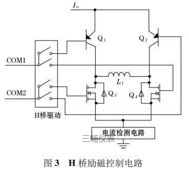 由圖 3 可知,I o 為高低壓切換恒流控制電路輸出的恒流源電流,H 橋驅(qū)動(dòng)的 COM1 端控制三極管 Q 1和場(chǎng)效應(yīng)管 Q 4 的通斷;COM2 端控制三極管 Q 2 和場(chǎng)效應(yīng)管 Q 3 的通斷。L 1 表示的是勵(lì)磁線圈(傳感器中線圈),COM1、COM2 為正交的 PWM 波信號(hào),因此在勵(lì)磁線圈 L 1 的兩端會(huì)產(chǎn)生方波勵(lì)磁信號(hào)。檢流電路主要是用來(lái)檢測(cè)勵(lì)磁線圈中電流的變化,當(dāng)線圈中的勵(lì)磁電流方向變化時(shí),可以及時(shí)將此信息反饋給高低壓切換恒流控制電路中的比較器,從而實(shí)現(xiàn)切換高低壓源達(dá)到恒流控制的目的。