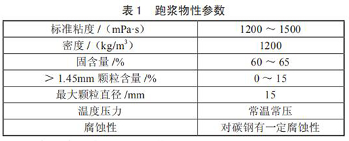 對跑漿進(jìn)行分析后發(fā)現(xiàn),跑漿是一種由煤漿和一些雜質(zhì)混合而成的半流體物質(zhì),當(dāng)甲烷流量計使用煤倉中煤堆中上部煤時,由于煤質(zhì)較好,跑漿中小煤塊極少,性質(zhì)同正常煤漿,只是固含量稍高;而使用煤堆底部的煤時,煤質(zhì)差甲烷流量計研磨不充分,跑漿中含有約 15% 的小煤塊,分析后的跑漿物質(zhì)參數(shù)如表 1 所示。