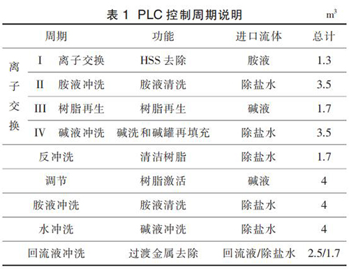 APU 的運(yùn)行按照事先設(shè)定的程序運(yùn)行,即嚴(yán)格遵循設(shè)定的步驟順序。 APU 的正確運(yùn)行依賴于每個步驟的順利完成。 按照預(yù)先設(shè)定好的步驟完成 1 個任務(wù)即視為完成 1 個 APU 運(yùn)行的“周期”。 離子交換的主周期被稱為“離子交換周期”。除此之外,整個控制程序還包含另外 5 個輔助周期, 分別為反沖洗周期、調(diào)節(jié)周期、胺液沖洗周期、水沖洗周期、回流液沖洗周期。 這 5 個周期在維護(hù)和非計劃停車后重新啟動時使用。 PLC 控制各個周期的說明見表 1。