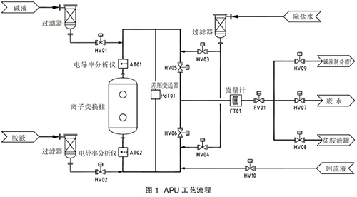 整個 APU 都是通過 PLC 程序自動控制的。程序通過控制閥門的開關(guān)使不同的液體按順序進(jìn)入離子交換柱,使離子交換柱中的液體按順序排出。