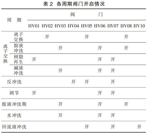 5)回流沖洗周期。 胺液每天都需取樣化驗,如果發(fā)現(xiàn)胺液中有不溶或懸浮的過渡金屬聚集,則每天運(yùn)行周期結(jié)束后需利用回流液對樹脂進(jìn)行清洗,以防止腐蝕和樹脂損壞。 如果選擇了此選項,PLC程序會在每天完成目標(biāo)數(shù)量的離子交換周期后,自動執(zhí)行回流液清洗周期。 各周期閥門對應(yīng)開關(guān)情況,如表 2 所示。