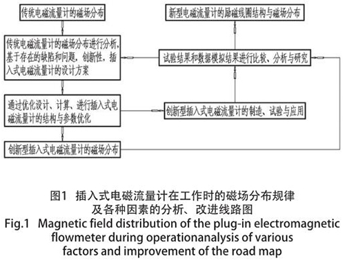 dn80泥漿流量計因其特殊的結(jié)構(gòu)形式,致使其抗干擾能力較弱、準確度偏低以及瞬時流量波動過大等不良現(xiàn)象,但便于安裝、造價低廉、普遍應(yīng)用于大管道等特點而存在。為了發(fā)揮其優(yōu)勢,消除其不利因素,對其內(nèi)部結(jié)構(gòu)及其相關(guān)技術(shù)參數(shù)進行優(yōu)化設(shè)計,從而使其準確度能夠達到 ±1% FS,使抗干擾能力得到極大地增強。本文主要通過優(yōu)化設(shè)計、選擇材料和試驗,使dn80泥漿流量計的穩(wěn)定性和準確度大幅度提高,并提出解決措施,對實際應(yīng)用具有參考價值。分析與研究程序圖如圖 1 所示。