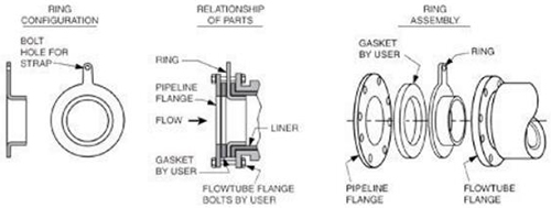 對于接地環(huán)應(yīng)用,如果使用傳統(tǒng)的孔板式或C型接地環(huán),則必須使用接地帶將接地環(huán)連接到流量管的主體/外殼。這些帶子連接到流量管的法蘭上,或接地線連接到位于其遠(yuǎn)程接線盒或頂部安裝的變送器接口板上的接線片上。E型接地環(huán)使用客戶提供的螺栓,而不是接地線或接地帶。