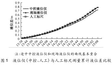 由圖 1 可知,人工標(biāo)尺測得的液位差值與現(xiàn)場液位儀基本吻合,其變化一致,但中控液位儀顯示的數(shù)據(jù)呈現(xiàn)一定的滯后性,這同信號的傳輸距離與解析方式相關(guān)。在日后的測量過程中,對于吸水井和清水池這些對測量結(jié)果影響較大的地方,需進行人工標(biāo)尺讀數(shù),或?qū)x表校驗后進行現(xiàn)場讀數(shù)記錄。