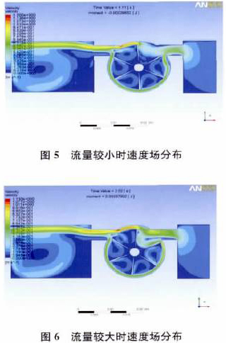 (1)數(shù)值仿真結(jié)果與物理實驗結(jié)果基本一致,當(dāng)流速低于啟動排量,渦輪未啟動時,流體沿葉片做繞角運動,葉片兩側(cè)壓力相等,葉片不轉(zhuǎn)動;當(dāng)流速高于啟動排量,渦輪轉(zhuǎn)動時,流體在腔內(nèi)產(chǎn)生旋渦,造成葉片兩邊壓差,從而造成葉片轉(zhuǎn)動。