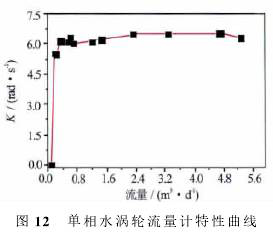可以看出,渦輪啟動后*先進入一個非線性段,在非線性相應(yīng)段,K值隨著流量增加而增大;當(dāng)流量比較大(單相水超過0.5m3/d,單相油超過1m3/d)時,渦輪進入線性段,在線性響應(yīng)段,K值達到峰值,有相對較小的波動。
