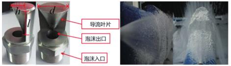 圖 1 為電弧風(fēng)扇噴嘴的結(jié)構(gòu)和噴霧,一種新型的噴嘴主要由一個過熱蒸汽渦街流量計入口、出口和導(dǎo)流葉片組成。出流口的圓柱形設(shè)計降低了湍流強度。導(dǎo)流葉片類似于流線型尾部,產(chǎn)生類似于弧形風(fēng)扇形狀的過熱蒸汽渦街流量計噴霧,其形狀類似于掘進機的粉塵源。