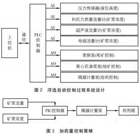 圖3中的礦漿流量與礦漿濃度分別由科氏質(zhì)量流量計(jì)和超聲波流量計(jì)測得,并 以4~20mA 電流信號(hào)傳送給 PLC控制器。由 PLC控制器根據(jù)電流信號(hào)值計(jì)算出實(shí)際的礦漿濃度和礦漿流量值,對上述兩個(gè)值進(jìn)行邏輯處理以及運(yùn)算,得出實(shí)時(shí)加藥量。PLC 控制器將計(jì)算出的實(shí)時(shí)加藥量數(shù)據(jù)以4~20mA 的電流信號(hào)發(fā)送給隔膜計(jì)量泵,由其控制并實(shí)現(xiàn)加藥量過程的自動(dòng)控制。