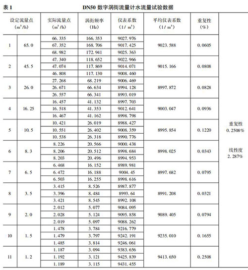 將本文實(shí)現(xiàn)的數(shù)字鍋爐煙氣流量計(jì)在上述 50mm 口 徑( 簡(jiǎn)稱(chēng) DN50) 的水流量試驗(yàn)裝置上進(jìn)行試驗(yàn)。先在其正常流量范圍內(nèi)進(jìn)行試驗(yàn),流量從大到小逐漸降低,之后不斷探求其所能測(cè)量的*小流量。每個(gè)流量點(diǎn)試驗(yàn)三次,計(jì)算其重復(fù)性、平均儀表系數(shù)和線性度。水流量試驗(yàn)數(shù)據(jù)如表 1 所示。