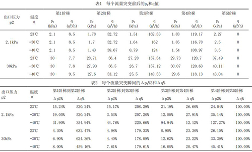 為了深入研究溫度及流量突變對衛(wèi)生級電磁流量計響應(yīng)速度的影響趨勢,把每個流量突變點前后的出口壓力p2,流量q列表如表1所示。