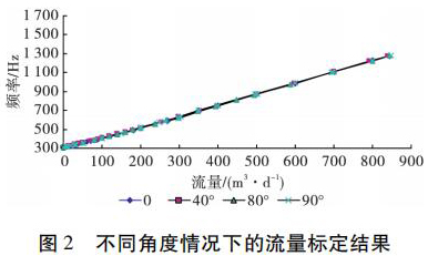 為了考察井眼斜度變化對電磁流量計測量流量的影響,開展了非集流高壓電磁流量計在不同斜度情況下的流量測量模擬實驗。模擬實驗在大慶油田多相流實驗室進行,儀器外徑 38 mm,模擬井筒內(nèi)徑為 124 mm,實驗介質(zhì)是水,傾斜角度分別為 0°、40°、80°和 90°( 水平) ,流量范圍為 5 ~ 850 m3 /d。實驗結果表明,在儀器居中條件下,井眼斜度變化對電磁流量計的儀表常數(shù)沒有影響,滿量程誤差不大于 4% ,因此可以應用高壓電磁流量計進行水平井注水剖面測量。不同角度情況下的實驗結果如圖 2 所示。