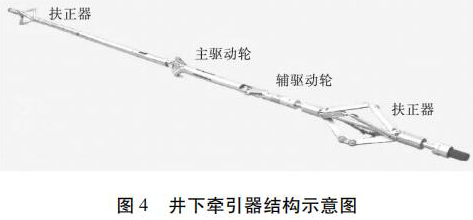 牽引器采用的是 Sondex 公司的牽引器,如圖 4所示。儀器外徑 54 mm,長度 7.4 m,牽引力 273 kg,耐壓103 MPa,耐溫 150 ℃,牽引速度 540 m/h。牽引器連接于電纜頭和測井儀器之間。在水平段和造斜段儀器不能靠自重下放,利用牽引器可以將儀器推送到測井目的層段。井下牽引器由兩組呈 90°交叉分布的驅動臂和扶正器組成。在進行井下儀器牽引時,*先打開牽引器驅動臂,使驅動臂端部的驅動輪支撐到套管壁并保持足夠的正壓力,然后驅動輪旋轉實現(xiàn)對儀器的推送。井下儀器牽引過程可在地面進行人工控制,通過控制命令和調(diào)整供電電壓可控制井下牽引速度和方向。該牽引器提供了多種井下測量參數(shù),包括電纜頭電壓和張力、牽引速度、接箍深度等數(shù)據(jù),所有這些沿井身測量到的參數(shù)均可在地面顯示出來,使施工具有安全性和可操作性。當斷開電源時,驅動臂在外力作用下可收回,保證儀器安全取出。