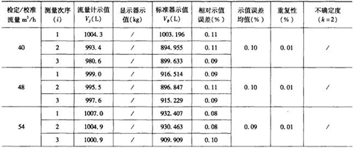 表1是用容積法現(xiàn)場檢測流量計后,電腦自動生成的原始記錄數(shù)據(jù)頁部分,表2是用質(zhì)量法現(xiàn)場檢測流量計后,電腦自動生成的原始記錄數(shù)據(jù)頁部分。