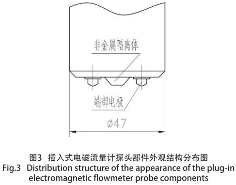 通過大量的試驗(yàn),對(duì)探頭端部外型結(jié)構(gòu)亦采用特殊設(shè)計(jì),從而消除兩個(gè)電極之間的擾流現(xiàn)象,同時(shí)亦消除因通電產(chǎn)生磁場(chǎng),導(dǎo)致兩個(gè)電極吸附介質(zhì)中的鐵屑而影響測(cè)量精度和死區(qū)效應(yīng),增強(qiáng)了輸出信號(hào)的穩(wěn)定性,從而提高傳感器準(zhǔn)確度和抗干擾性。通過結(jié)構(gòu)的優(yōu)化設(shè)計(jì),使用壽命更長(zhǎng),測(cè)水流量計(jì)探頭局部,如圖 3 所示。