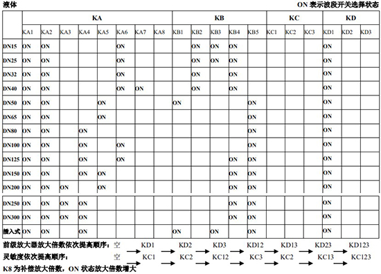 (4)標況流量計算公式,單位 t/h:四、AMPKP09A01 放大板波段開關調(diào)整參照表五、AMPSW10A01 放大板波段開關調(diào)整參照表RG=1-F 調(diào)放大器增益,由 1 至 F 依次增大(常用 4-8);RS=1-F 調(diào)觸發(fā)靈敏度,由 1 至 F 依次提高(常用 4-8)不同口徑和介質(zhì)開關選擇參見附表。并根據(jù)實際信號先調(diào)整 K2 和 K3 擴展頻帶,必要時調(diào)整 K1 電荷放大器增益以上表值僅供參考,實際使用中因液體粘度和氣體密度不同應在此值附近調(diào)整,頻率低時可將 K3 向大口徑方向調(diào)一至三檔。頻率高時可將 K2 向小口徑方向調(diào)一至三檔。訂貨須知及選型樣譜一.尊敬的用戶,當您要選用本公司產(chǎn)品時,請仔細閱讀選型樣本,并做好以下工作:1.認真核對被測介質(zhì)的工況條件:溫度、壓力、管徑等工藝參數(shù)。2.認真核對被測介質(zhì)的使用流量范圍,特別是*小流量值以*終確定使用儀表的口徑及配管參數(shù)。3.確定儀表的安裝地點,保證直管段,并為儀表的安裝維護創(chuàng)造好的環(huán)境條件。4.填好訂貨咨詢單,見附表三二.渦街流量儀表選型表(符合 JB/T9294-1999 標準)1.傳感器選型表上一篇:污水流量計的種類