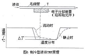 液體用tmf 在20世紀(jì)90年代初中期開始發(fā)展并在工業(yè)生產(chǎn)中應(yīng)用,但當(dāng)前主要為微小流量儀表。有消耗功率測量法的熱分布式tmf和利用珀爾帖( peltier)致冷元件在檢測部位致冷(即附加熱)的tmf。后者的測量原理如圖6所示,流量傳感器由測量毛細(xì)管、電子冷卻裝置(珀爾帖元件)和3各溫度檢出件組成。測量管和致冷元件接觸,無液體流動時冷卻到某一溫度時,兩者溫度相等;液體流動時致冷元件附近測量毛細(xì)管溫度上升,如虛線所示分布,測量溫度檢測點的兩者溫度差以求的流量。