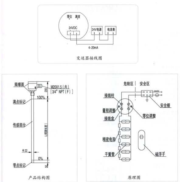 磁浮球液位計(jì)由液位傳感器和電流轉(zhuǎn)換器兩部分組成,浮球與液位同步變化,控制彈簧管吸合斷開(kāi),從而使傳感器內(nèi)電阻成線性變化,再由轉(zhuǎn)換器將電阻的變化轉(zhuǎn)換成4~20mA標(biāo)準(zhǔn)電流信號(hào)并疊加數(shù)字信號(hào)輸出。能對(duì)開(kāi)口、密閉容器或地下池槽里的介質(zhì)液位在儀表控制室內(nèi)進(jìn)行顯示、報(bào)警和控制。