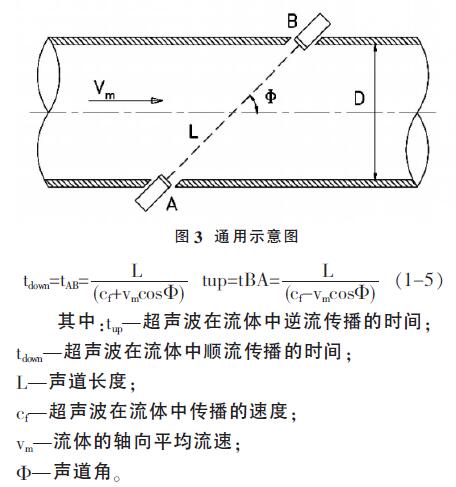 2、超聲流量計(jì)以測量超聲波在流動(dòng)介質(zhì)中傳播的時(shí)間與流量的關(guān)系為原理。通常認(rèn)為超聲波在流體中的實(shí)際傳播速度是由介質(zhì)靜止?fàn)顟B(tài)下超聲波的傳播速度cf和流體軸向平均流速vm在超聲波傳播方向上的分量組成。如圖,順流和逆流傳播時(shí)間與各量之間的關(guān)系是