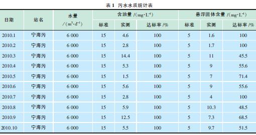 以一礦為例,2010年1~10月寧海污水站累計(jì)處理污水187萬(wàn)m3,日均6200m3,1~10月份外輸污水含油累計(jì)達(dá)標(biāo)率100%,外輸懸浮物累計(jì)達(dá)標(biāo)率69.7%(見(jiàn)表1)。