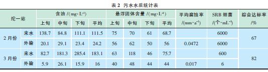 2011年2月坨一站來(lái)水含油平均183.1mg/L,外輸含油平均16mg/L,懸浮固體平均8.3mg/L,平均腐蝕率0.017mm/a,SRB 細(xì)菌平均6個(gè)/mL。只有懸浮固體含量超標(biāo)。