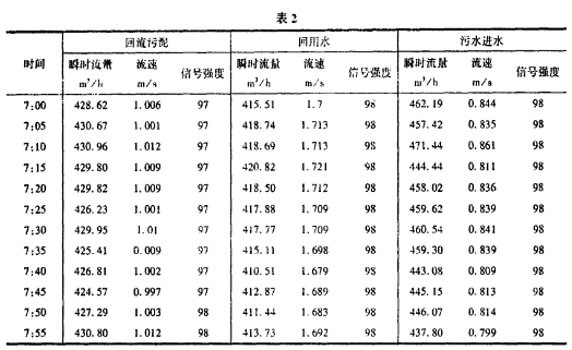 下面是隨機(jī)地從計(jì)算機(jī)中抽取的某一日的幾組數(shù)據(jù)(表2)。從表中可以看出采用超聲波流量計(jì)側(cè)量數(shù)據(jù)精確度較高,讀取數(shù)據(jù)方便,從信號(hào)強(qiáng)度上可以看出,在測量回流污泥時(shí),信號(hào)強(qiáng)度較低,這是由于液體濁度較高,含有較大固體顆粒引起信號(hào)衰減造成的。
